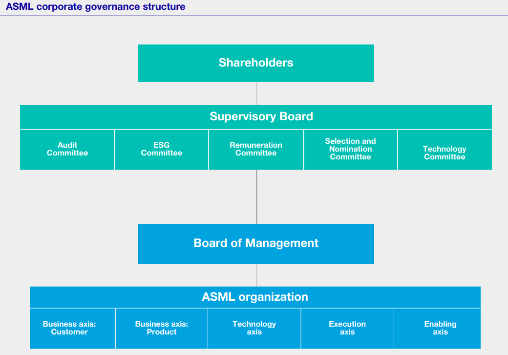 ASML’s corporate structure is quite straightforward. They have a two-tier board structure consisting of a Board of Management responsible for managing the company, and an independent Supervisory Board which supervises and advises the Board of Management. For the fulfillment of their duties, the two Boards are accountable to the General Meeting, the corporate body representing all shareholders.
