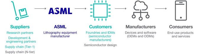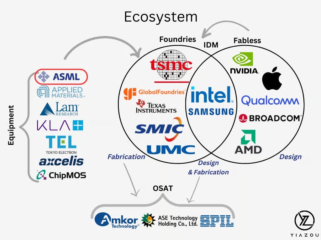 The semiconductor market is a difficult intertwined system. Companies cannot exist without each other. The below picture is a nice representation of the ecosystem ASML operates in. If I had to change anything, I’d put ASML in the middle. Without ASML’s machines, this ecosystem simply cannot exist.