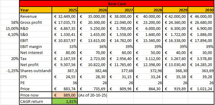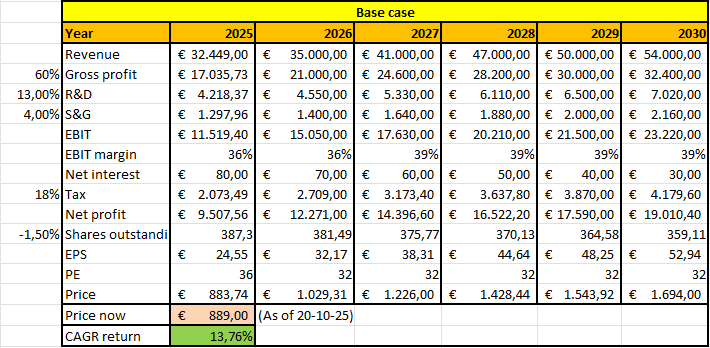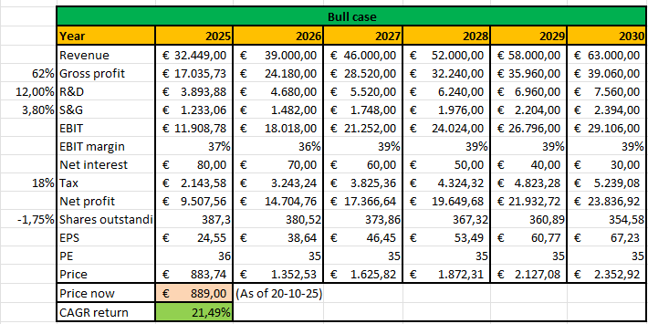 In this base case, I assume revenue of €54 billion in 2030, with a gross margin of 60%. This implies a revenue CAGR of 10,74% from today’s price.